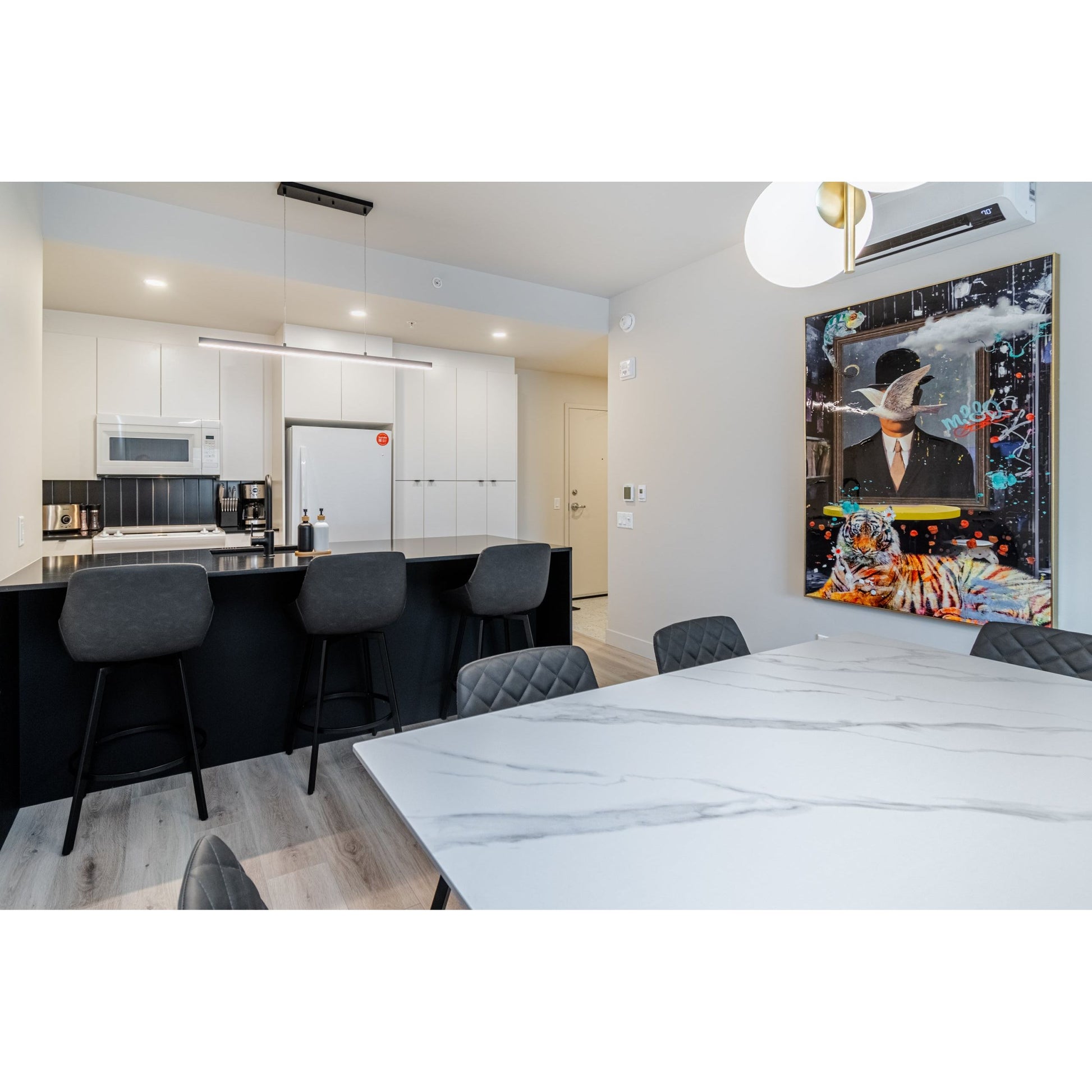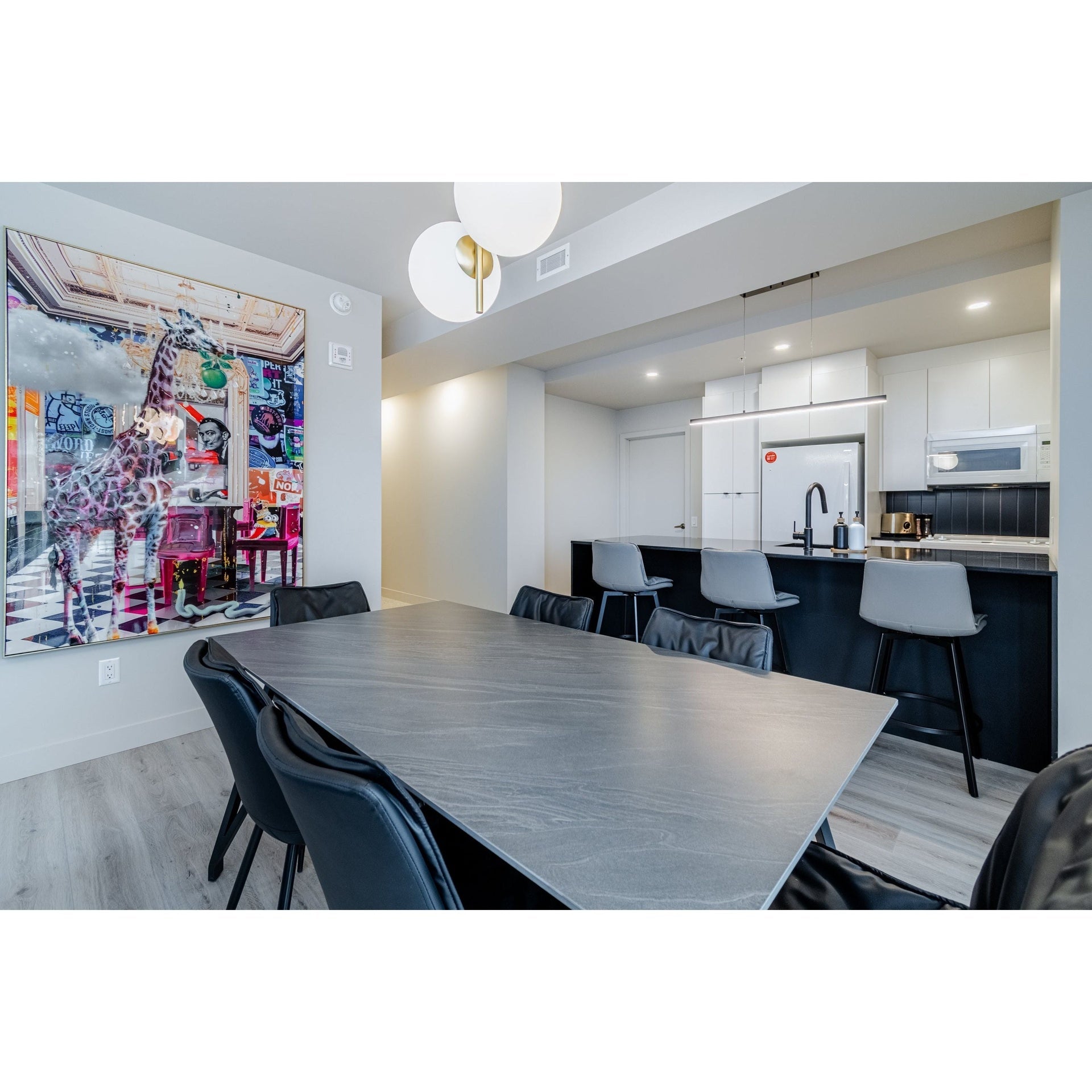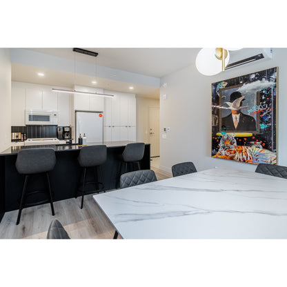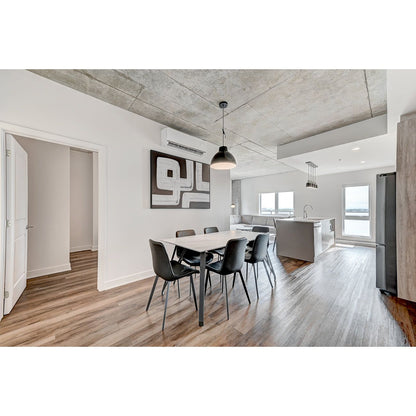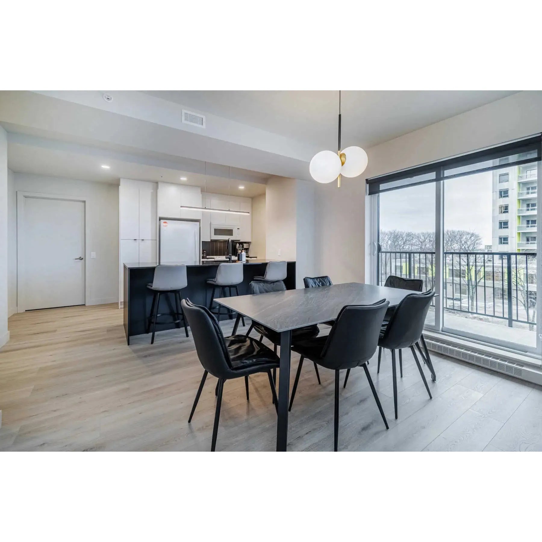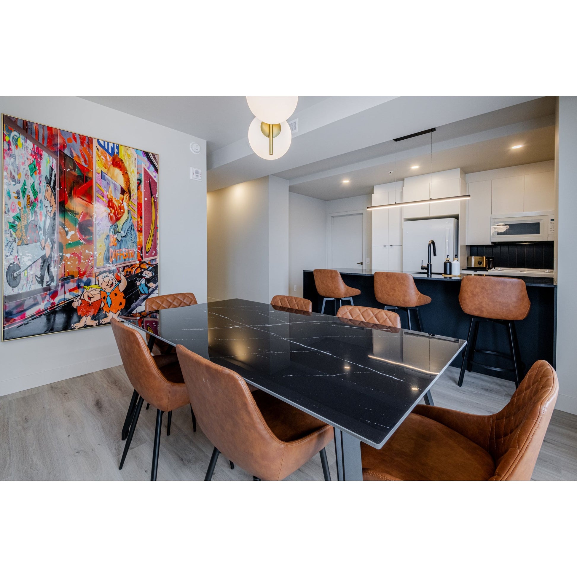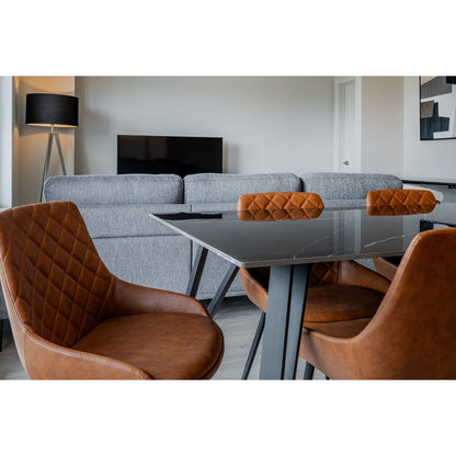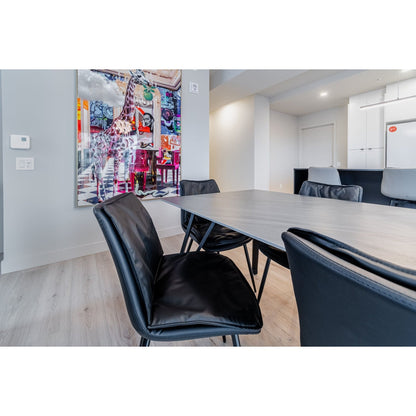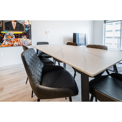 This dining table embodies timeless elegance. Its striking design combines sophistication and functionality to create an exceptional dining space. Black sand powder coated table legs add a contemporary touch to this piece, while providing unwavering stability. Every detail of this table has been considered to perfectly balance style and resilience.